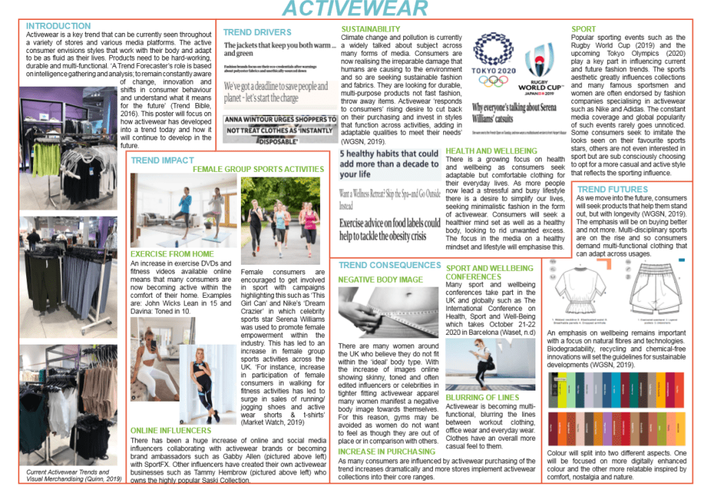Project 1: The above shows a trend forecasting poster for activewear. It highlights the key trend drivers, impact, consequences and futures and gives insight into the overall trend. I created this as part of a university assessment in my second year.